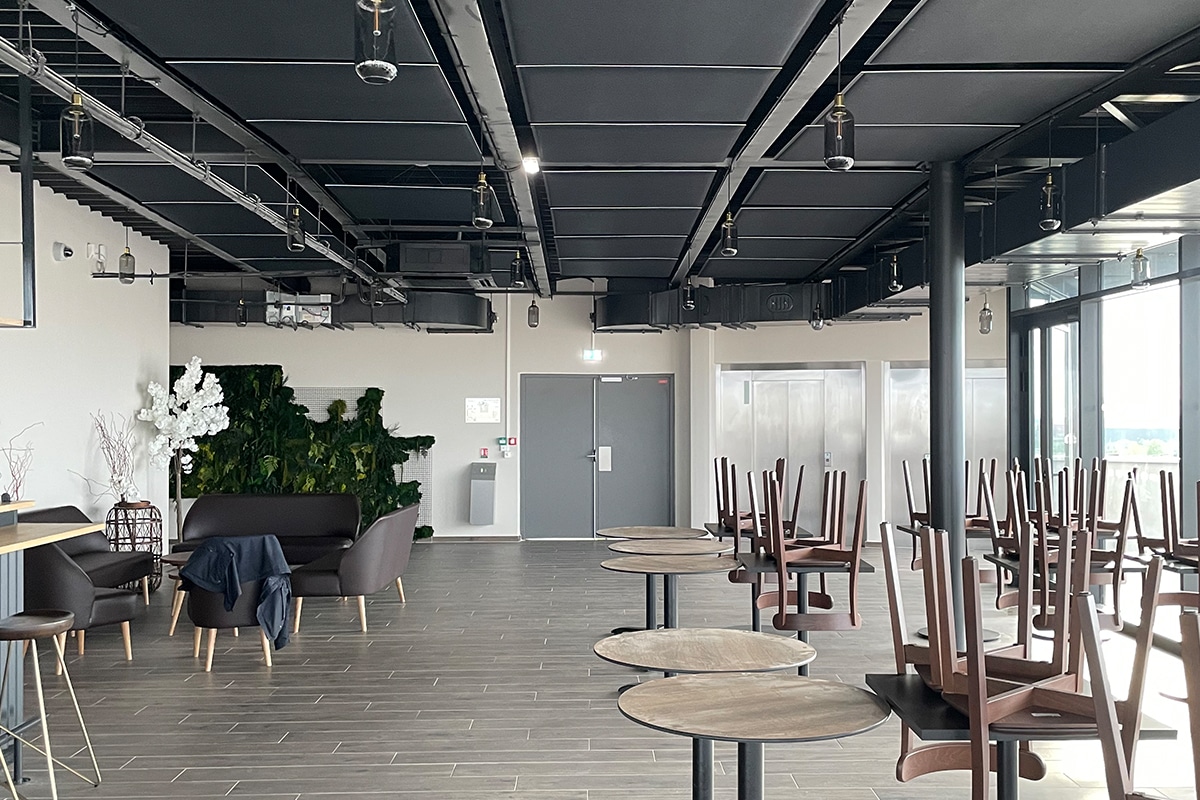 En effet, lors de ma première visite, le bâtiment venait d’être livré et ce dernier étage n’avait jamais été occupé. Il y avait cependant déjà un bar plus que sommaire et un ensemble de mobilier.